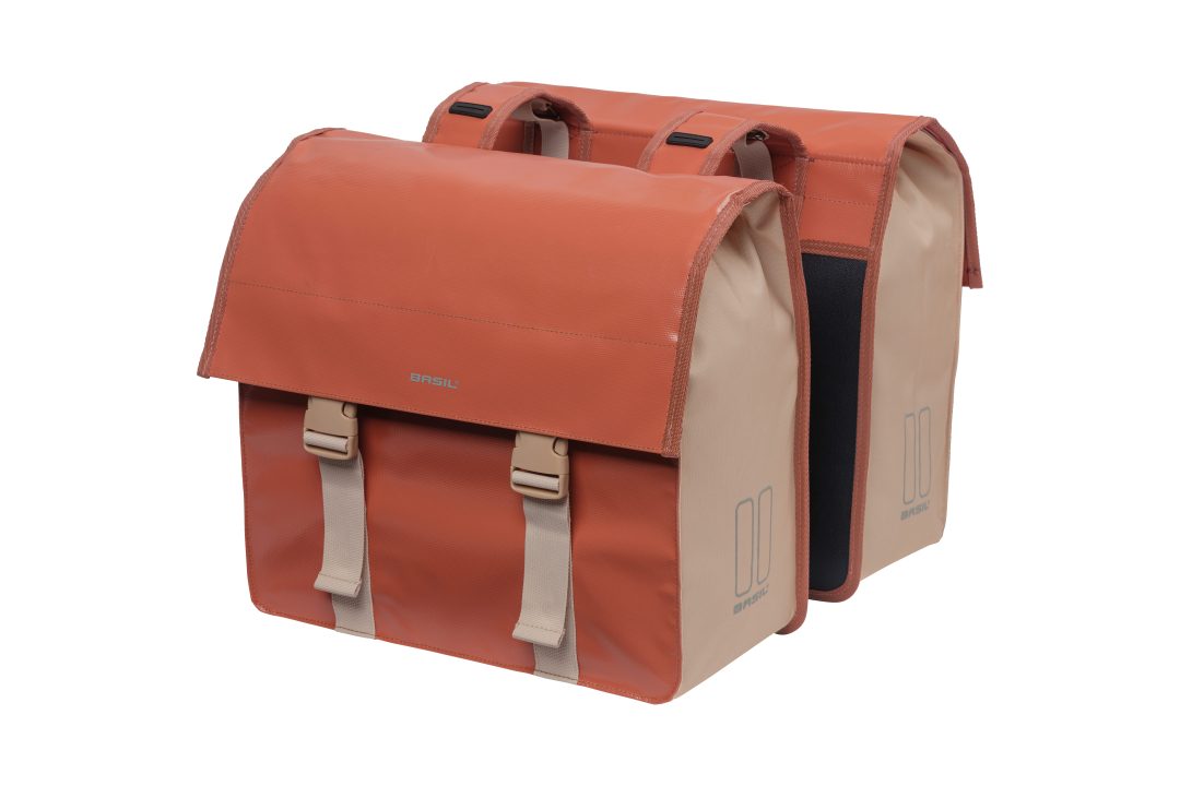 Met de Basil fietstas dubbel Urban Load in terra red/rose geniet je van 48 tot 53 liter aan veelzijdige opbergruimte, perfect voor dagelijkse boodschappen, werkspullen of weekendtrips. Dankzij het waterdichte tarpaulin en polyester materiaal blijven je spullen droog, ongeacht het weer. De waterkerende vouwsluiting en kliksluitingen zorgen voor een veilige en eenvoudige sluiting, terwijl de tas dankzij de Universal Bridge moeiteloos te bevestigen is op diverse dragers zoals Basil DBS, MIK en Racktime (platen apart verkrijgbaar). Met reflecterende details fiets je bovendien extra veilig in het donker.