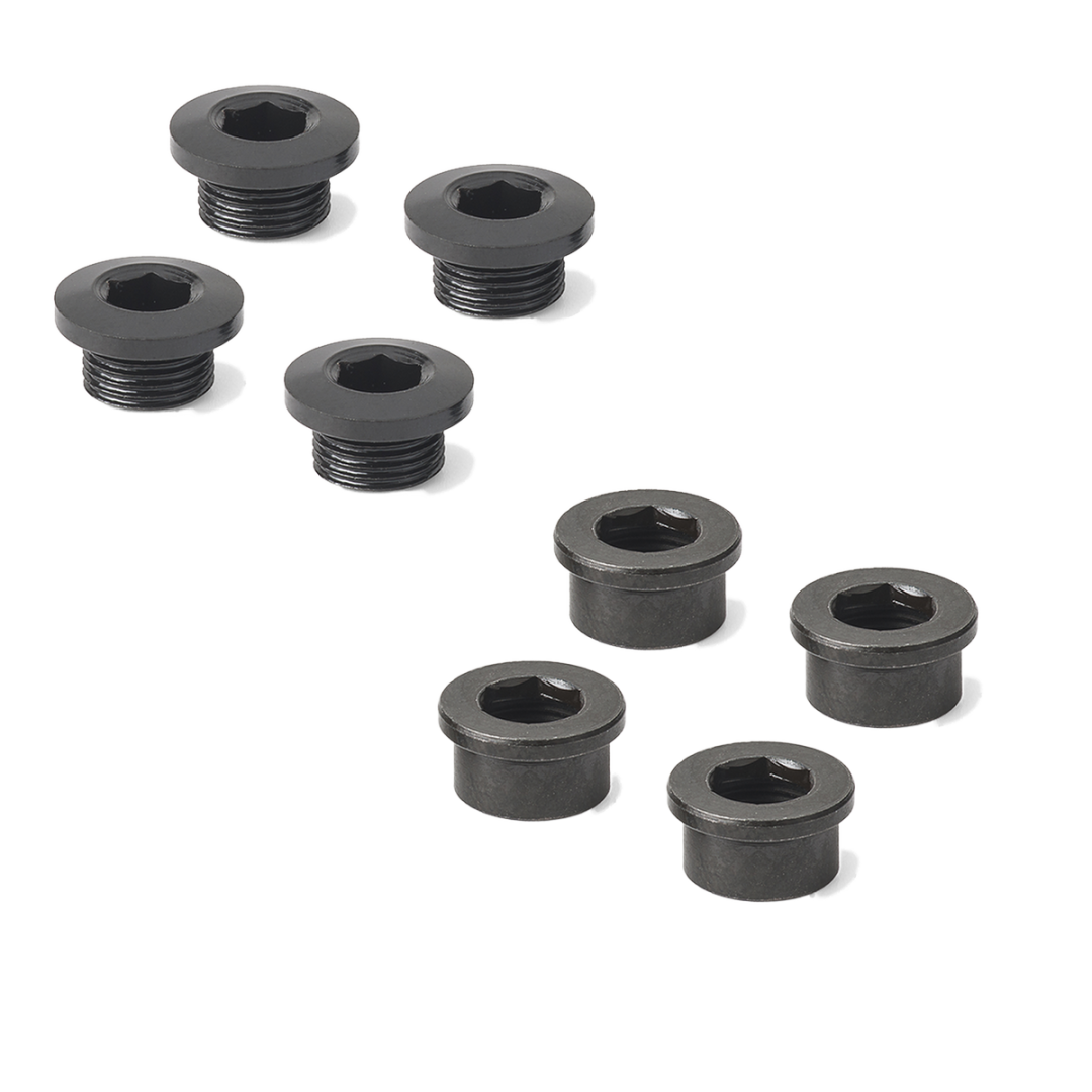Deze kettingbladschroeven bieden een betrouwbare oplossing voor het bevestigen van je single 4-arm kettingblad. Het geanodiseerde staal garandeert een lange levensduur en optimale bescherming tegen corrosie. De combinatie van 4 mm inbuskoppen voor zowel schroef als moer maakt het monteren eenvoudig en stevig. Met een specifieke schroefdraad en buslengte sluit alles naadloos op elkaar aan, waardoor je kettingblad stabiel blijft, zelfs onder zware belasting.