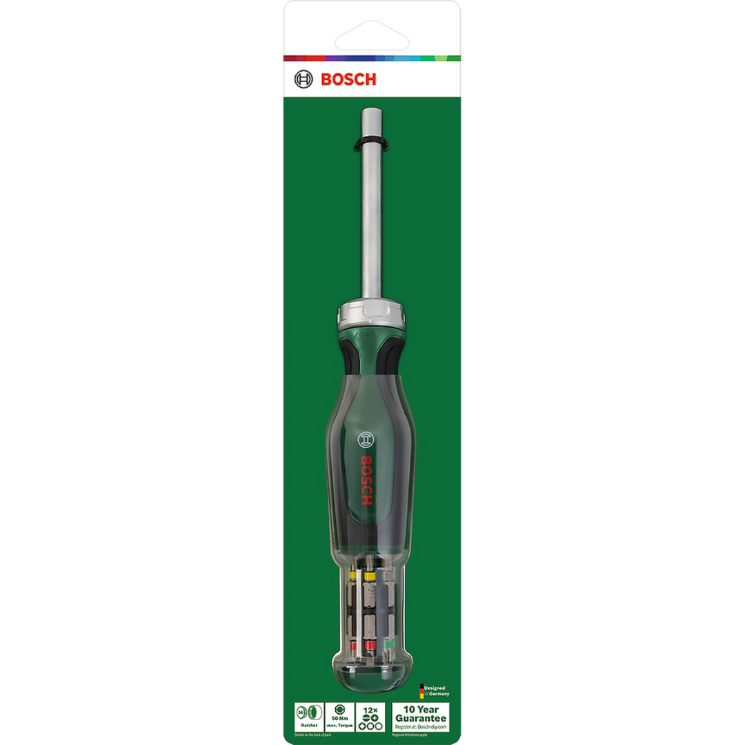 De combinatie van een 36-tands ratelfunctie en een maximaal draaimoment van 50 Nm maakt dit gereedschap krachtig en betrouwbaar. De magnetische bithouder en lange schacht van 80 mm zorgen voor stabiliteit bij elke schroef. Het ergonomische softgrip ontwerp geeft je optimale grip en controle, terwijl de metalen ring je intuïtief laat wisselen tussen links- en rechtsdraaiend schroeven. Het geïntegreerde pop-up bitdepot met 12 bits van duurzaam S2-staal in verschillende maten en kleurcodering maakt het wisselen van bits snel en overzichtelijk.