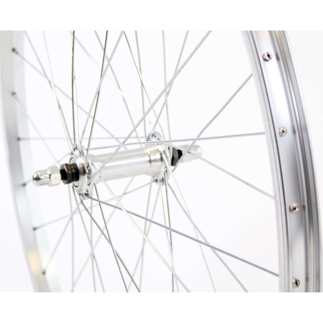 Het voorwiel combineert een vaste as met een duurzame aluminium velg die speciaal is ontworpen voor elektrische fietsen. De zilveren afwerking geeft niet alleen een stijlvolle uitstraling, maar beschermt ook tegen corrosie. De zinken spaken zorgen voor extra stevigheid en een optimale spanningsverdeling, wat resulteert in een betrouwbare en onderhoudsvriendelijke oplossing